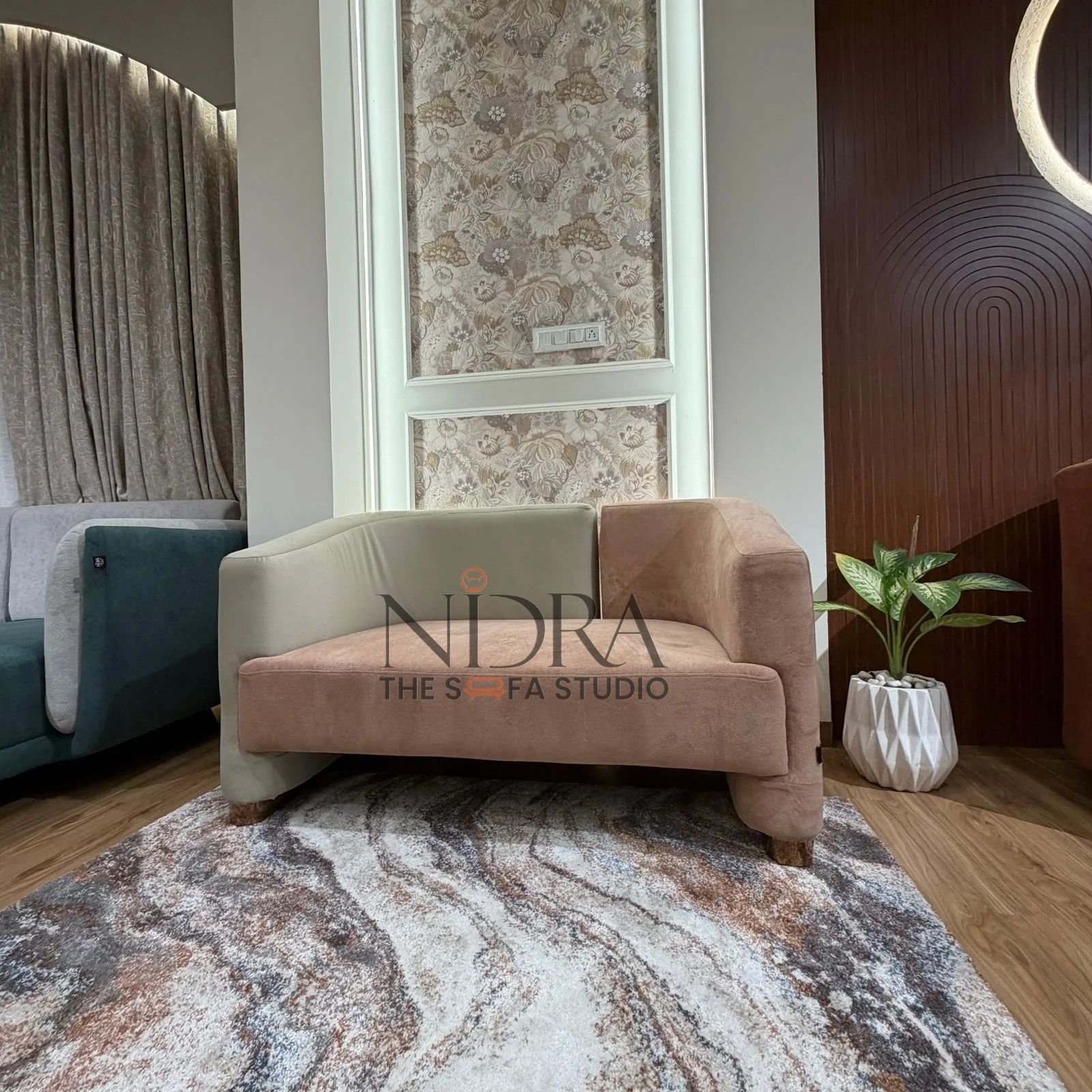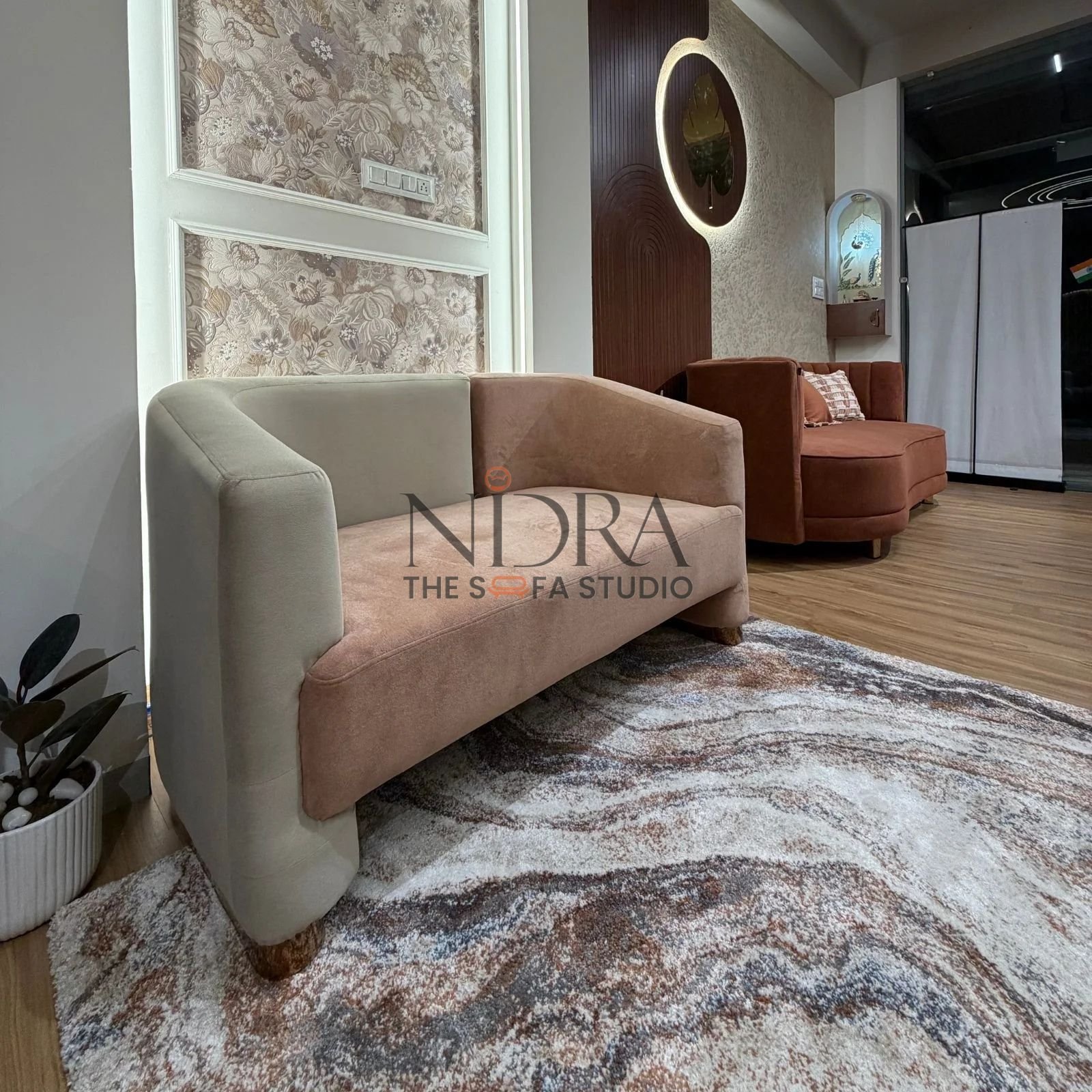 Ardha Chandra from Nidra : The Sofa Studio is a beautifully crafted 2-seater sofa designed for comfort and everyday living. Upholstered in premium-quality fabric, it offers a smooth and inviting feel while adding elegance to your space. Its modern two-tone design enhances its visual appeal, while the cushioned seat and supportive backrest make it ideal for relaxing, reading, or enjoying quiet moments. The rounded armrest design provides a snug and cozy seating experience with a unique contemporary look.