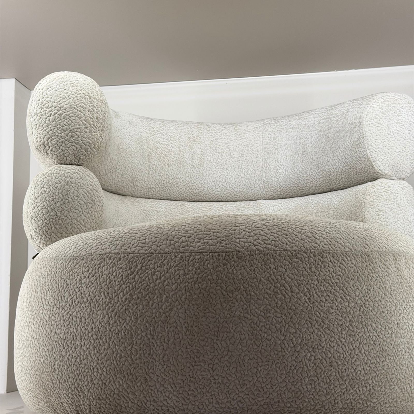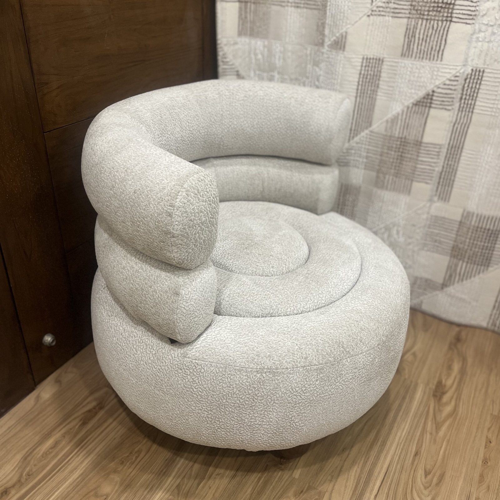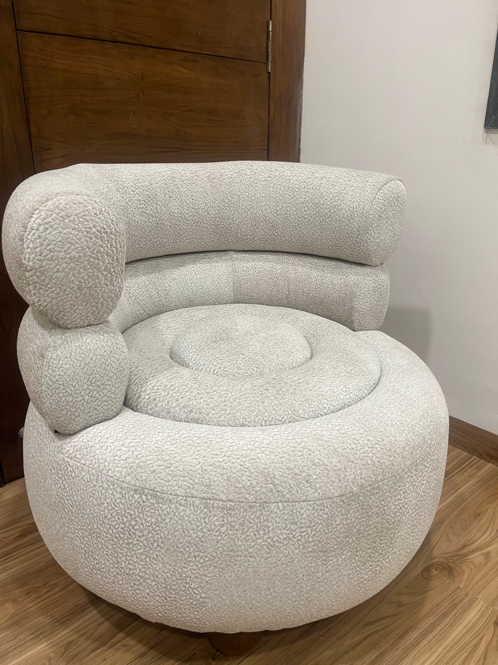 Chakrika by Nidra : The Sofa Studio is a modern accent chair in Indore featuring a unique rounded design, premium fabric upholstery, and comfortable cushioning. This stylish single seater chair is perfect for living rooms, bedrooms, and reading corners.