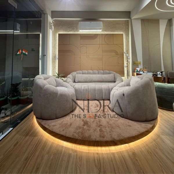 Sukoon luxury fabric sofa by Nidra : The Sofa Studio, Indore features premium upholstery, deep cushioning, and a modern curved design for ultimate comfort. A perfect modern sofa set in Indore for stylish and premium living room interiors.